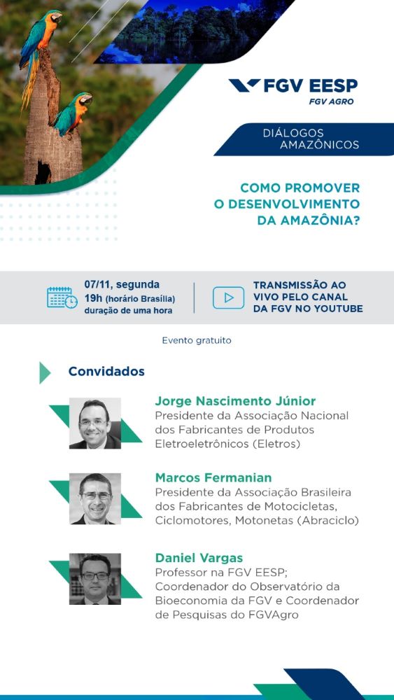 O desenvolvimento econômico e a sustentabilidade podem – e devem – caminhar juntos na região Amazônia. A FGV, com o apoio do Centro da Industria do Estado do Amazonas (CIEAM) promove no próximo dia 7 de novembro, a partir das 19h, mais um episódio do evento Diálogos Amazônicos, com o tema “Como promover o desenvolvimento da Amazônia?”. Os especialistas presentes discutirão como diversificar a atividade econômica na região e, ao mesmo tempo, promover a bioeconomia, mantendo a floresta em pé.
