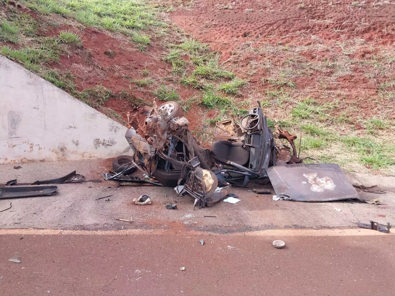 | Veículo ficou completamente destruído após cair em viaduto na rodovia | Foto: Região Realidade |