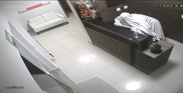 Nas imagens, é possível ver o criminoso coberto com um lençol, revirando a recepção do escritório e na sequência fugindo do local levando um notebook,