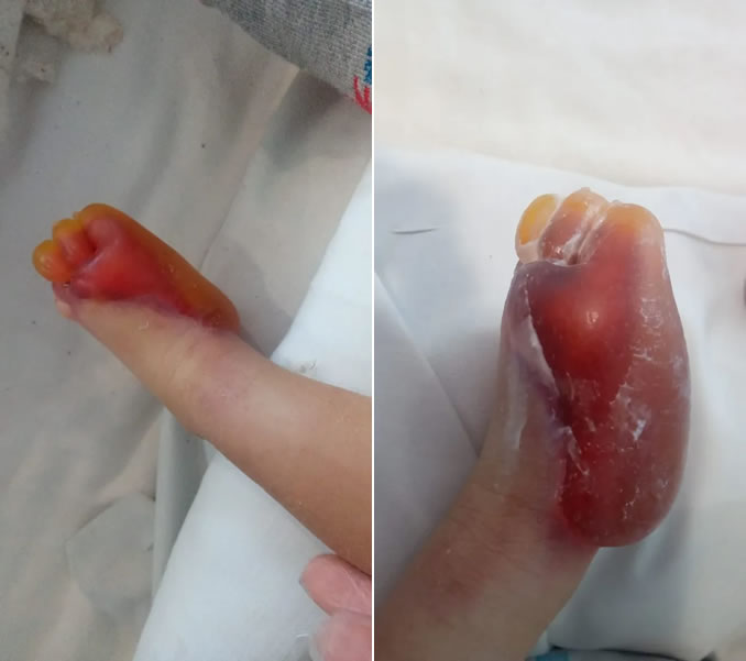 A pequena estava internada no hospital há dois meses para tratar da síndrome e, segundo os pais, já estava prestes a receber alta. “Chegamos no hospital no domingo (1/1), por volta de 12h40, para ver nossa filha. Eu fiquei no carro e a Adrieli entrou, passou pouco tempo ela saiu chorando, contando o que tinha acontecido, que a Agatha estava com uma grande queimadura no pé esquerdo”, contou o pai.