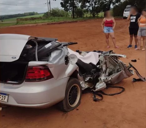 | Carro envolvido em acidente na SP-255, em Itaí, no interior de São Paulo, ficou totalmente destruído | Foto: Redes sociais |