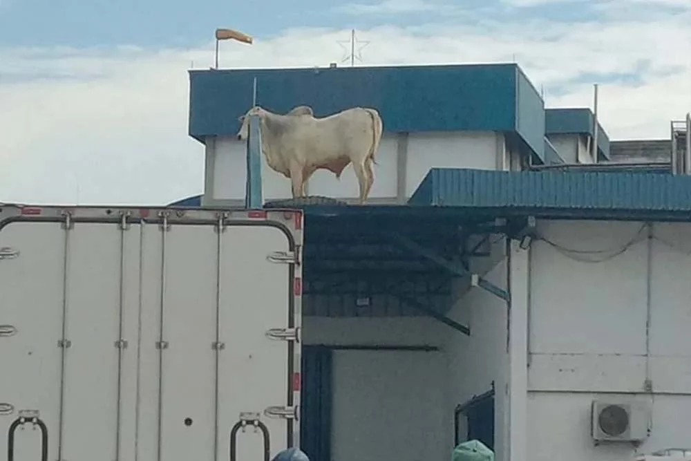 Um boi foi flagrado em cima do telhado de um frigorífico em Lençóis Paulista, no interior de São Paulo, nesta terça-feira (28).