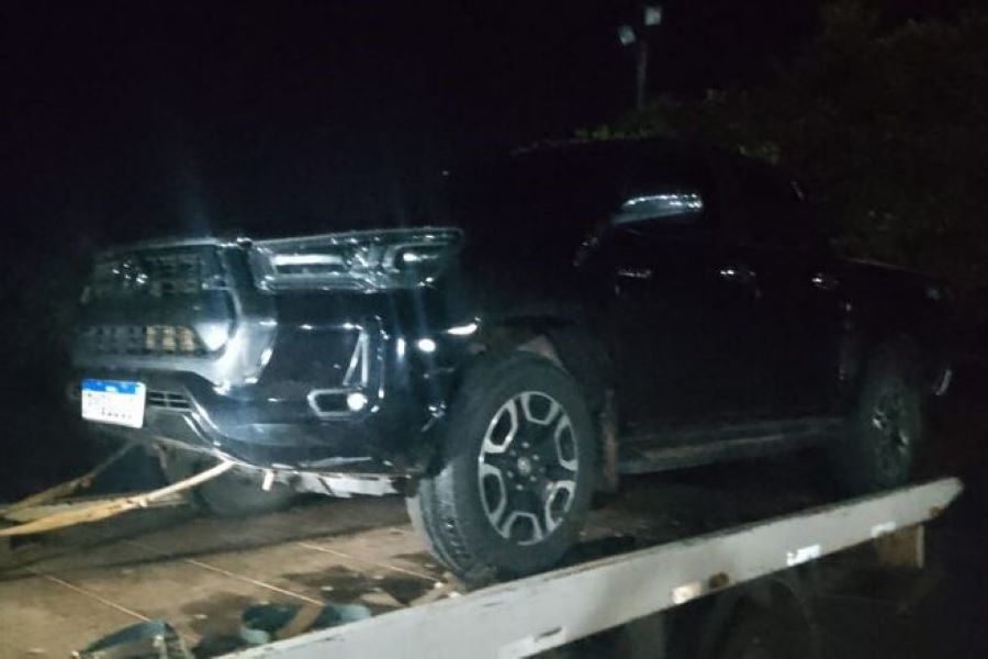 A caminhonete preta estava em estado de abandono e no local após pesquisa, a placa que ela ostentava pertencia a um HB20. Já pelo número do chassi constatou-se que a placa do veículo seria outra e produto de roubo.