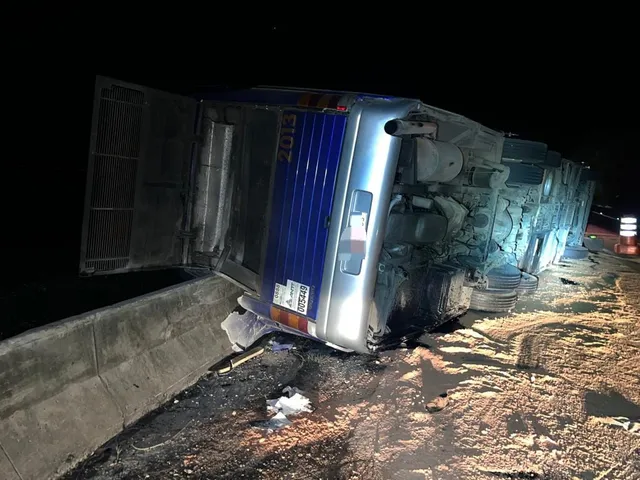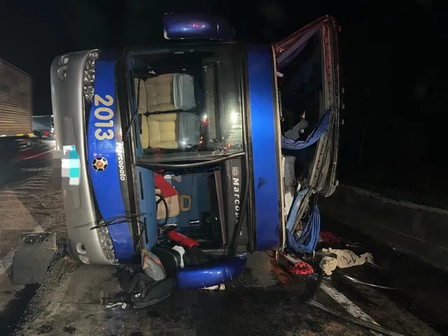 O motorista não ficou ferido e disse aos policiais que perdeu o controle na curva vindo a tombar sobre a faixa da esquerda. O ônibus caiu sobre uma mureta de proteção.