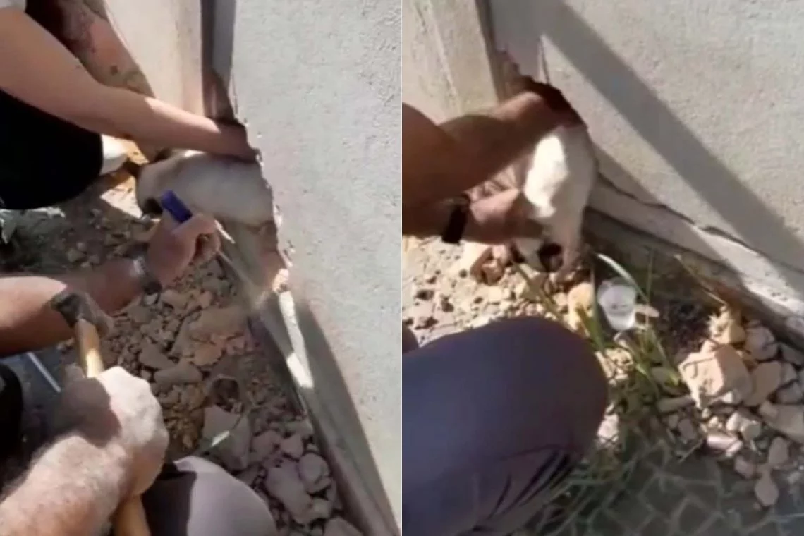 De imediato eles se deslocaram até o bairro e com ajuda de populares abriram um buraco maior na parede com ferramentas e o animal foi resgatado.
