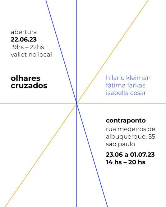 Fátima Farkas, Hilário Kleiman e Isabella Cesar e seus diferentes pontos de vista, cruzaram seus olhares, que resultaram na exposição que ocupa a Galeria Contraponto, na Vila Madalena, de 23 de junho a 1º de julho.