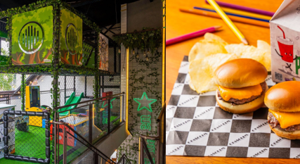 Área kids na unidade da Zona Norte do O Pasquim Bar e Prosa (Créditos: Divulgação) e a dupla de mini cheeseburgers com fritas