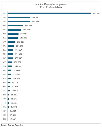 Em números absolutos, os estados do Sudeste concentraram o maior volume de inadimplidos, (total de mais de 4,3 milhões), pela região Sul (mais de 1,3 milhão) e a Nordeste (ultrapassou a marca de 1,2 milhão). O Centro-Oeste (707 mil) e o Norte (481 mil) foram os com menor volume de companhias no vermelho. Veja no gráfico abaixo o detalhamento das Unidades Federativas (UFs):