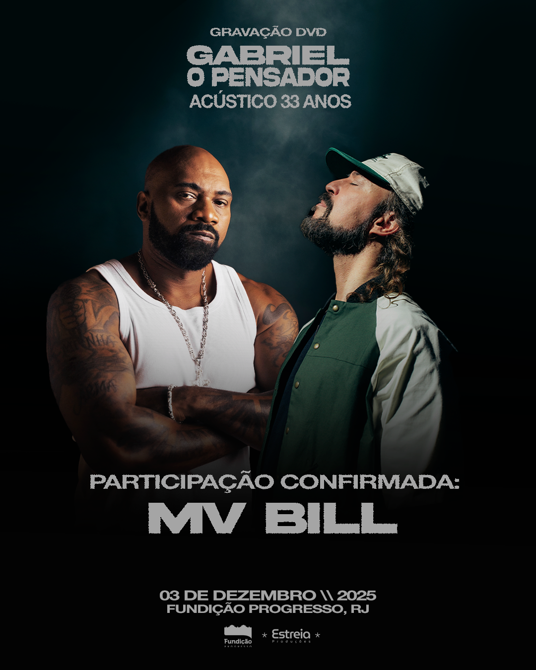 Gabrielopensador confirmou a participação de mvbill no show “Acústico 33 Anos”, que será gravado no dia 3 de dezembro, na Fundição Progresso, no Rio de Janeiro. O projeto celebra mais de três décadas de carreira do rapper.