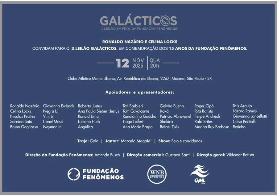 A noite desta quarta-feira, 12 de novembro de 2025, promete ser uma das mais elegantes e solidárias do ano. Ronaldo Nazário e Celina Locks comandam o II Leilão Galácticos, em comemoração aos 15 anos da Fundação Fenômenos, no Clube Atlético Monte Líbano, em São Paulo. O evento beneficente reúne personalidades do esporte, da televisão, da moda e do entretenimento em uma celebração que une glamour e solidariedade.