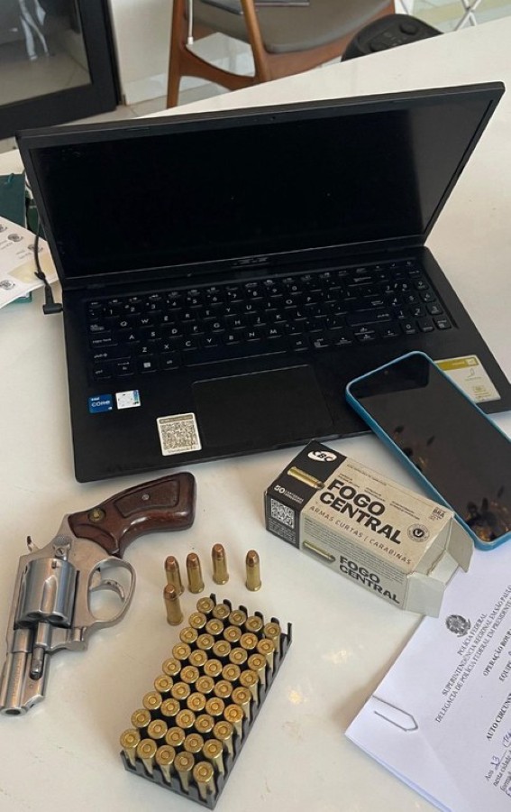 Durante o cumprimento dos mandados, foi apreendida uma arma de fogo na residência de um dos investigados, que foi preso em flagrante pelo crime de posse irregular de arma de fogo.