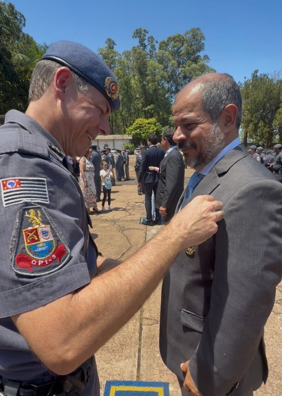 Empresário foi agraciado com a Medalha “Patrono do CPI-3 – Coronel PM Paulo Monte Serrat Filho”, honraria destinada a personalidades que contribuem com a Policia Militar em prol da segurança pública paulista