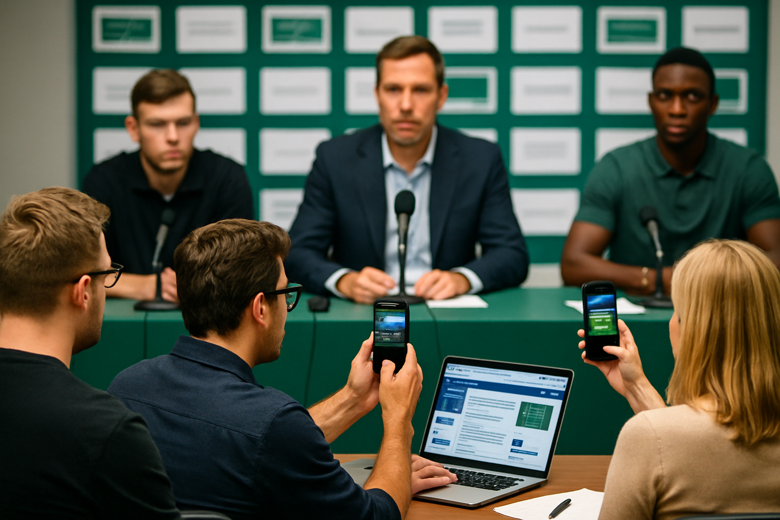 Jornalistas em coletiva de imprensa de futebol representando a cobertura esportiva profissional