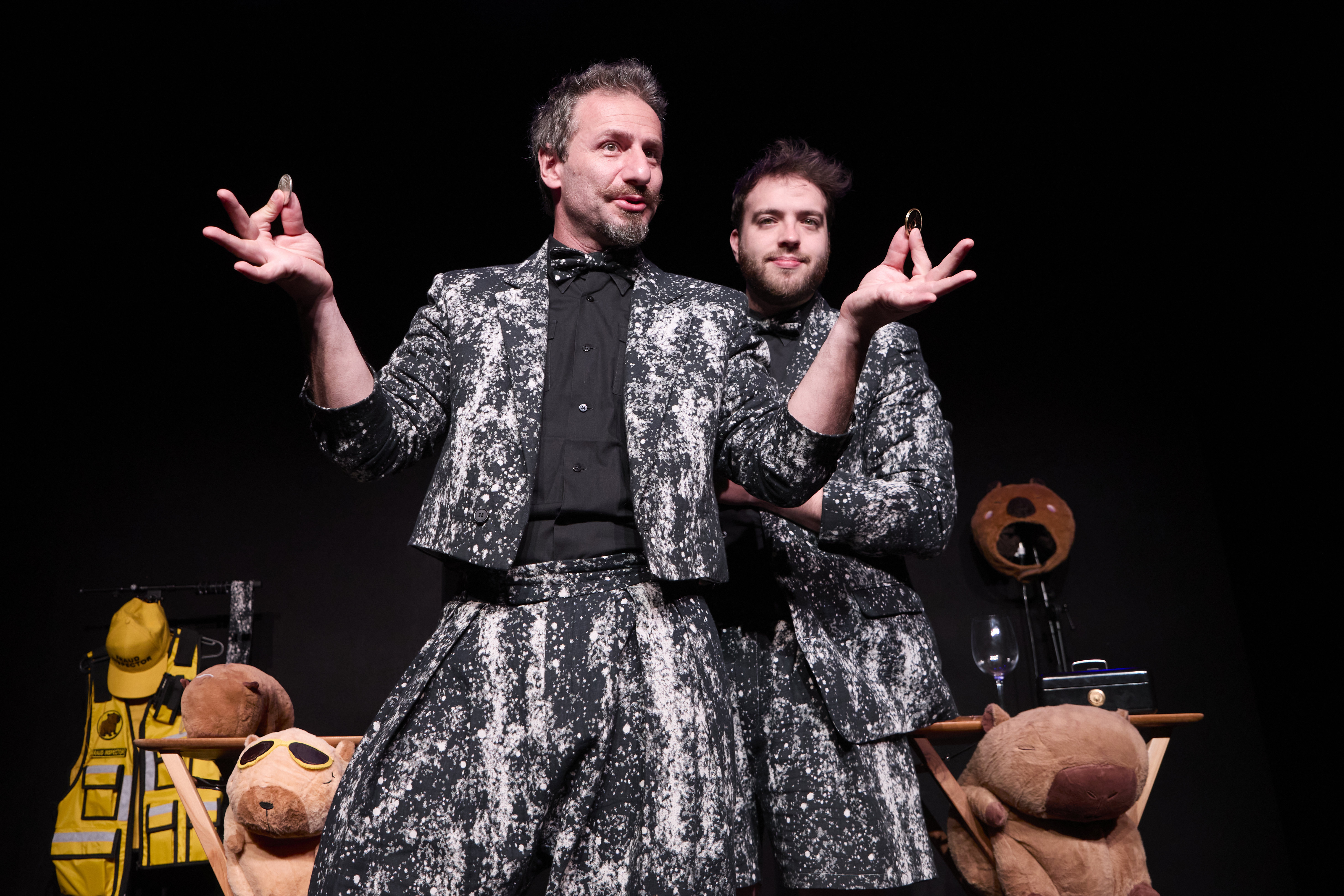Ricardo Malerbi é um dos nomes mais experientes da mágica brasileira, formado pela Academia Brasileira de Artes Mágicas e graduado em Comunicação e Artes do Corpo pela PUC-SP. Rudi Solon é mágico, ator e pesquisador, mestre em Ciências da Comunicação pela ECA-USP, com pesquisa dedicada à ilusão como fenômeno comunicativo. Juntos, integram a Cia. Fundo Falso.