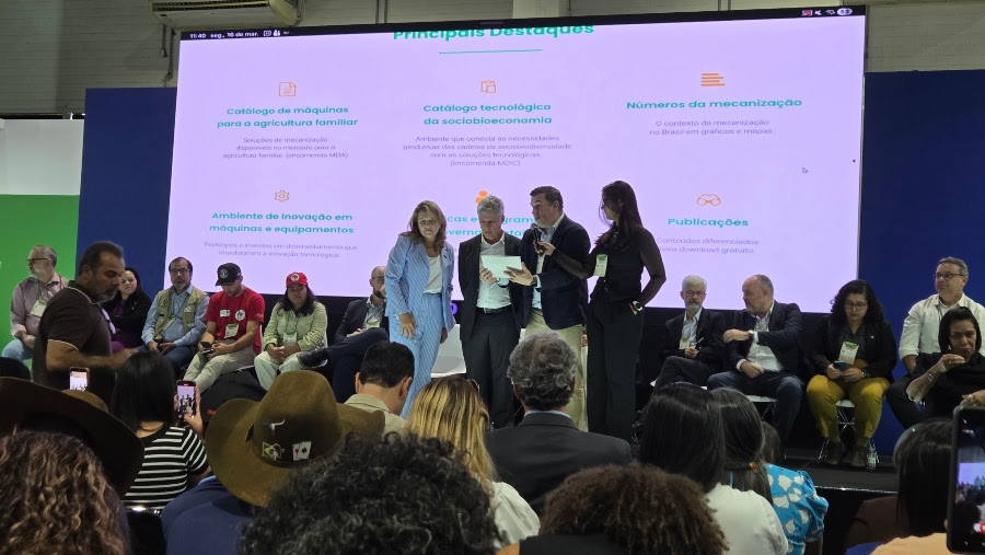 O ministro do Desenvolvimento Agrário, Paulo Teixeira, falou sobre o papel de ferramentas como o Mecaniza para fazer com que o conhecimento chegue até o produtor rural, ajudando em sua atividade produtiva. Ele lembrou ainda a necessidade de a Embrapa estar sempre próxima à agricultura familiar para contribuir com os agricultores em transformações importantes que ocorrem no campo, como, por exemplo, a mudança de uma agricultura baseada em insumos químicos para uma agricultura de base biológica.