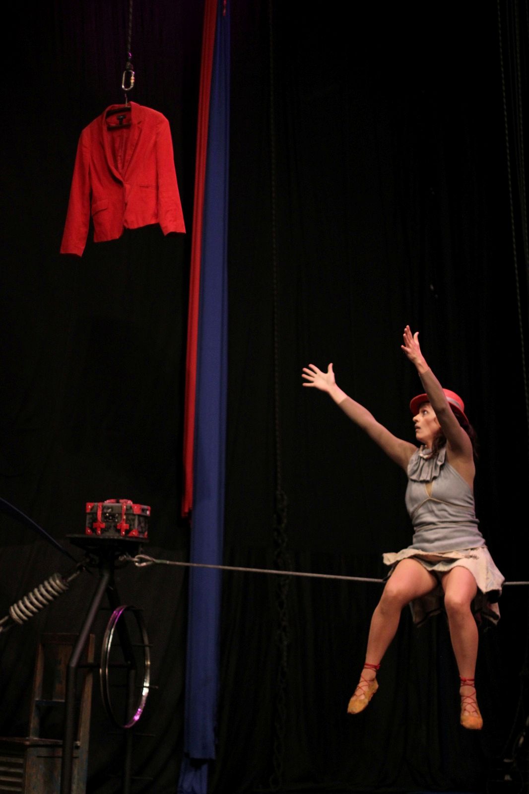 Com humor e delicadeza, “Casaco Vermelho” aborda temas como encontro, descoberta e resiliência, explorando linguagens como palhaçaria, equilibrismo e manipulação de objetos. Ao longo da apresentação, os personagens se desafiam em ações surpreendentes — como atravessar um cabo de aço em busca de um furtivo casaco vermelho.