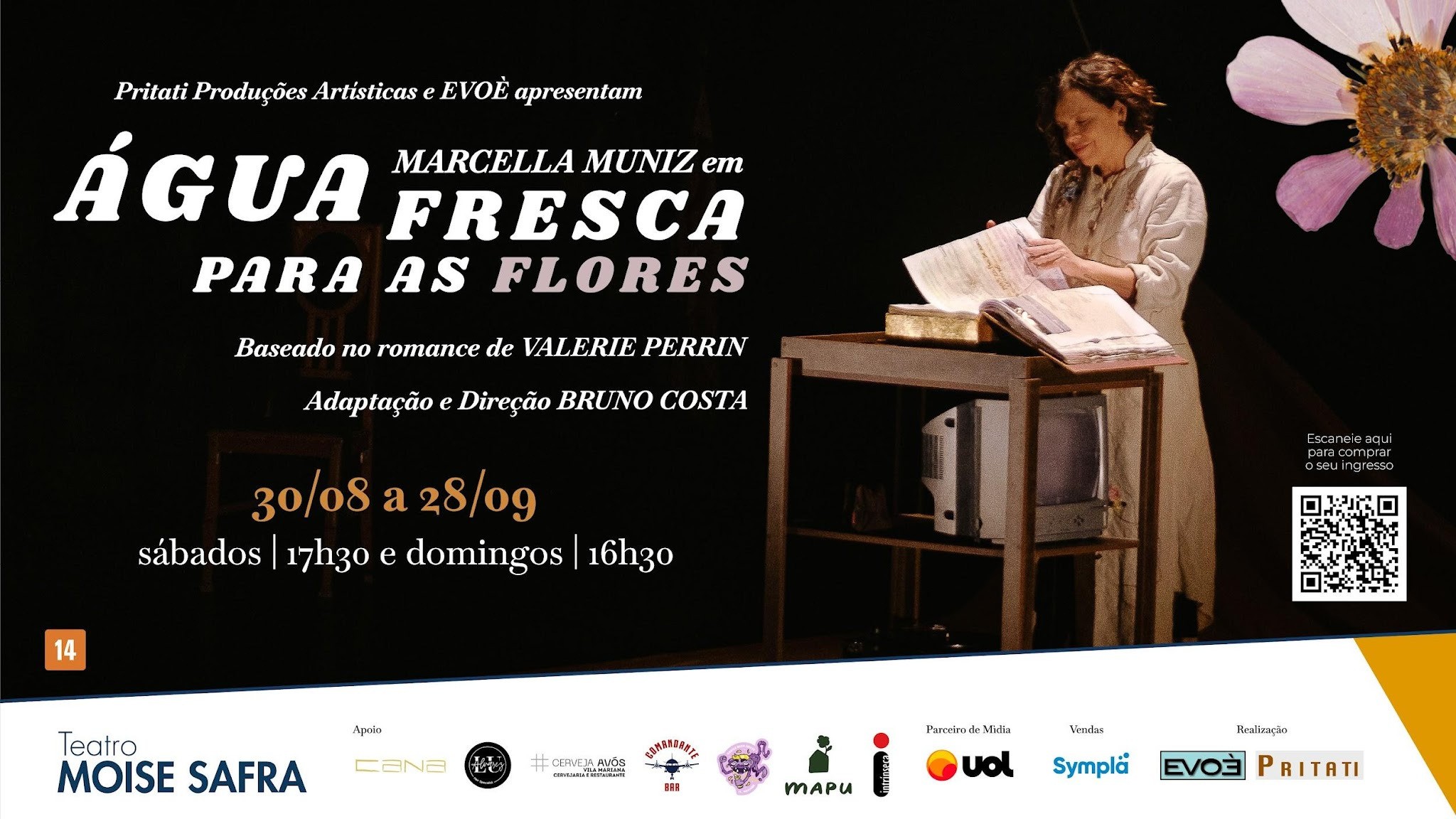 Nos dias 7 e 21 de junho, a atriz Marcella Muniz participa de um clube de leitura sobre o livro “Água Fresca para Flores”, no Sebo Pura Poesia. O bate-papo acontece antes das sessões do espetáculo e é aberto ao público mediante reserva. O Sebo Pura Poesia fica na Rua Costa Aguiar, 1.112, no Ipiranga. A entrada é gratuita. Mais informações pelo telefone (11) 948020506.