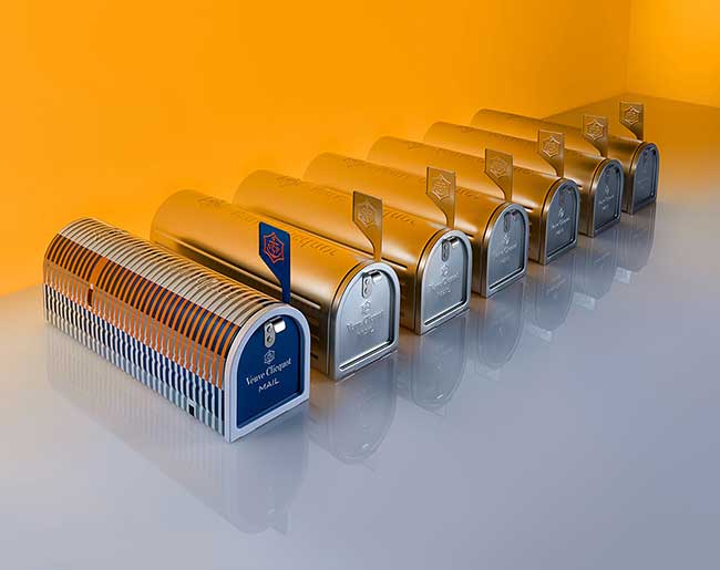 Uma releitura das caixas de correio vintage americanas, Clicquot Mailbox é uma caixa de correio metálica, na cor “yellow Clicquot”, e desenhada perfeitamente para acomodar uma garrafa de 750 ml de Veuve Clicquot Brut. Pode ser encontrada nos principais empórios, supermercados, delicatessens e lojas de vinhos do país (preço sugerido de venda: R$320,00).